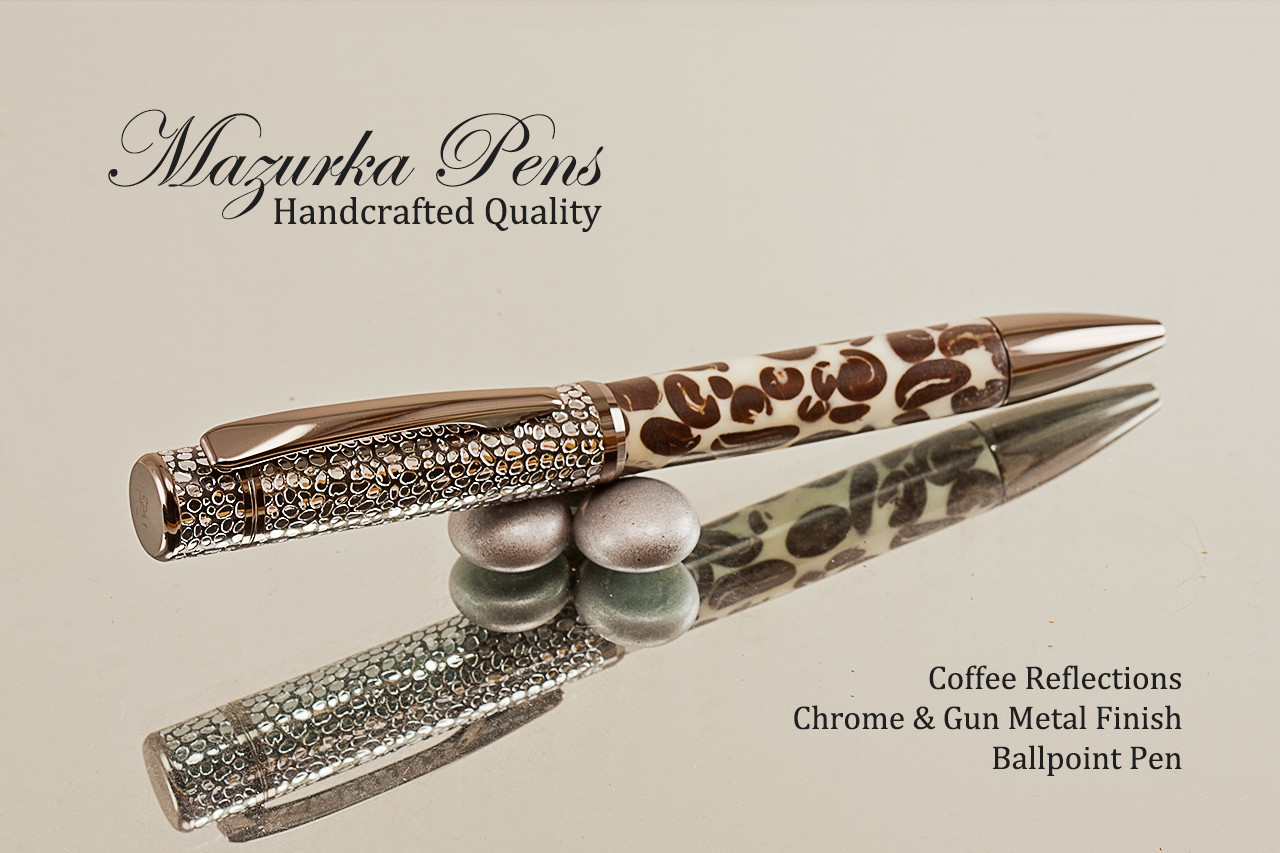 Loading... Please wait...It's a Coffee Day! The Coffee Reflections Pen is a fun and unique way to start your day. The top has the look of small Chrome mirrored stones. The smooth materials have a Gun Metal finish with the lower piece being made of real coffee beans in resin. This pen has lots of personality, it will start any day off with a spin. We've never combined these elements, so this is a new style for us.